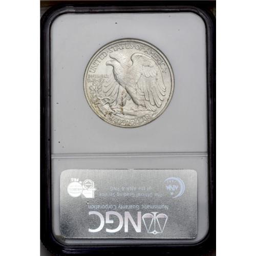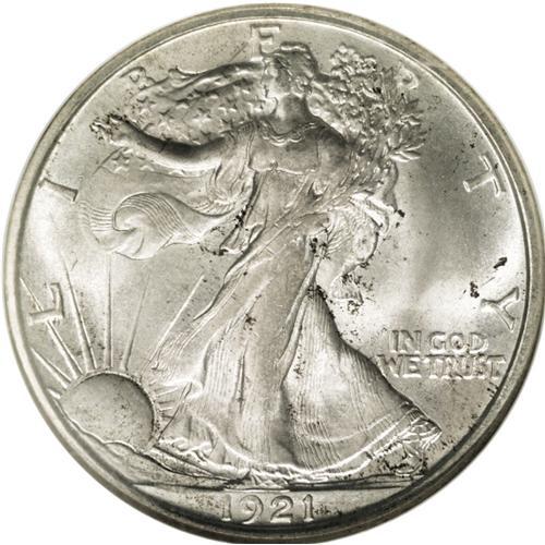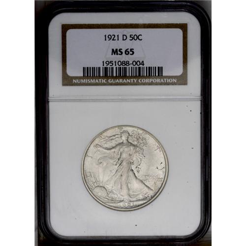 <B>1921-D<50C> MS65 NGC.</B></I> The 1921-D has the lowest mintage of the Walking Liberty half dollar series, and is scarce in all grades, especially in VF and higher. Bruce Fox, in his <I>The Complete Guide to Walking Liberty Half Dollars,</B></I> writes: "1921 was a recession year and there was a large reduction in business activity due to the end of the war. There was little need for small denomination coinage and the mints concentrated on silver dollars. Few halves were saved in mint state." In this regard, NGC and PCGS have certified fewer than 375 Uncirculated '21-D half dollars, most in the MS62 to MS64 range. Only about 50 Gems have been graded, with six pieces finer (3/06).<BR> The lustrous surfaces of this Gem example are visited by occasional speckles of russet toning. The design elements are well impressed, including relatively sharp definition on Liberty's left thumb. A couple of minute marks on Liberty's midsection are mentioned for accuracy.