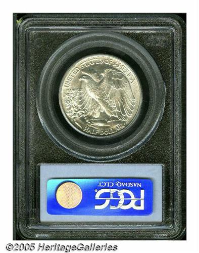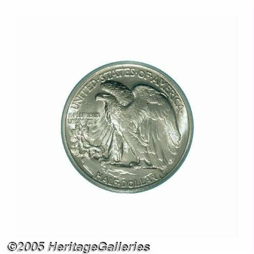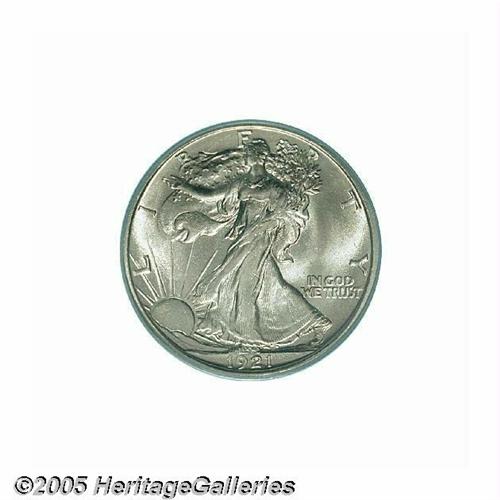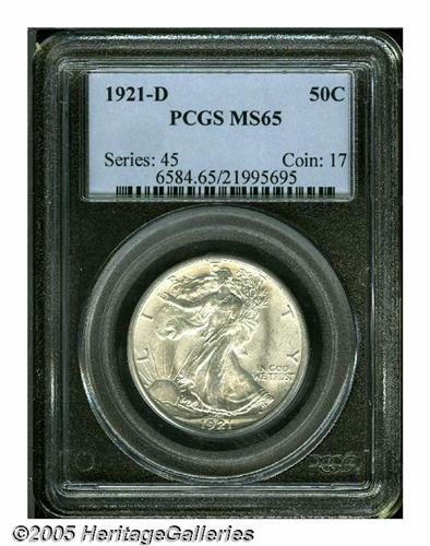 <B>1921-D<50C> MS65 PCGS.</B></I> This issue's original mintage of 208,000 pieces is the lowest in the entire Walking Liberty Half Dollar series. Most representatives of this issue grade no finer than Fine, and Gem quality survivors such as the present specimen are more difficult to locate than their 1921-P counterparts. This coin is generally well struck, but the central obverse is a little softly detailed over the highpoints, and many of the eagle's trailing leg feathers are indistinct. We stress, however, that these features detract little from the fully frosted, blemish-free sheen on both sides. Both sides impart a satiny, snow-white appearance and only a couple of very minor marks are noted on Liberty's leg and the right obverse field. This is a strong candidate for inclusion in the finest Half Dollar collection. Population: 32 in 65, 3 finer (6/05).