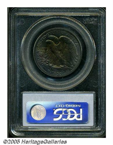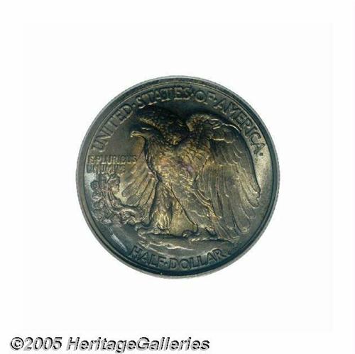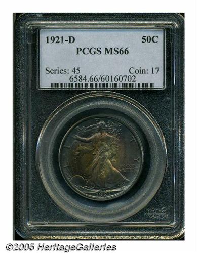 <B>1921-D<50C> MS66 PCGS.</B></I> A deeply toned example of this elusive key date that has achieved the coveted Premium Gem grade. Note the fullness of the strike on Liberty's hand and thumb, which shows excellent definition for this series. Rarely are Walking Liberty half dollars found really sharp, and this feature adds to the desirability of this particular coin. The mintage of 208,000 is the lowest of all Walking Liberty half dollars, very few were saved at the time of issue, and most circulated for many years before being saved. The obverse is emblazoned with dusky blue shades with tinges of purple which subtly fades to lighter violet-rose and then to the final lemony-yellow at the center. Matching colors on the reverse, although the center tones are not quite so concentrically organized. Ample luster resides in the fields, and this helps the toning to come alive when the coin is examined under a light. The combined NGC and PCGS Population reports state a total of six coins have been graded this high (three coins by each service as MS66), with none seen finer by either service. Thus, if you demand the absolute finest available, and appreciate toned coins, then make sure to bid accordingly on this handsome rarity.<BR>The American economy stumbled badly in 1920 and 1921. Massive disruptions caused by the world gearing up for World War I then returning to a post war economy sent shock waves around the world markets. In America the wheels of commerce rapidly slowed, demand slowed as well, disrupting the demand for coinage. Of great importance was the powerful silver lobby in America, which managed to pass a law which required the coinage of large numbers of silver dollars (mostly, but subsidiary coins as well) to replace the silver dollars taken from circulation under the Pittman Act of 1918. Accordingly 86,730,000 Morgan silver dollars were struck by the three mints in 1921, as the legislation for the new Peace dollar had not yet been signed into law. Once the new Peace dollar designs were adapted and modified, coinage began in earnest for those too, with the combined mints stamping out over 84,000,000 Peace dollars dated 1922. The smaller denominations were all but ignored during 1921, which is relevant to this particular Walking Liberty half dollar. An American classic that is destined for a monumental collection.