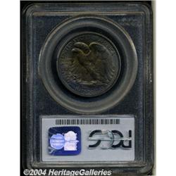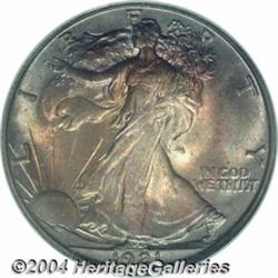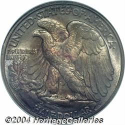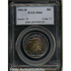 <B>1921-D<50C> MS66 PCGS.</B></I> 1921 was a recession year and there was a notable reduction in business activity due to the end of World War I. This resulted in a reduced demand for smaller denomination circulating coinage, all three mints were now concentrating on Silver Dollar production at record levels.<BR> One of the widely recognized keys to the Walking Liberty Half Dollar series, the 1921-D has the lowest mintage of its type with a mere 208,000 pieces struck. Breen's research indicates only two die pairs were used to coin '21-D Halves. The first pair produced 165,000 examples, the second pair 92,672 for a total of 257,672 pieces. Apparently 49,672 coins never left the mint and were subsequently melted, resulting in the stated net mintage figure of 208,000. This coin is legitimately scarce in grades above Very Fine, and Mint State pieces are predictably elusive. This is the result of very few being saved from the channels of commerce, both initially, as a result of the upcoming Great Depression, and the subsequent war years of the 1940s. At the Gem Uncirculated level, there is no doubt that the 1921-D is a classic 20th century rarity.<BR> The surfaces of this remarkably high quality survivor are noteworthy for their deep, original toning, being dominated by shades of violet and golden-rose. The obverse takes on a concentric pattern of color while the toning is more evenly and deeply dispersed on the reverse. Under a light source, the flash of the colors is dazzling. Beneath the natural color, the coin is intricately detailed, essentially blemish-free, and fully possessed of thick mint luster. For pedigree purposes, a single tiny contact mark is seen under close examination on Liberty's extended right forearm near her elbow. This piece will make a splendid addition should total originality be one of the criteria for top notch set of Walkers. Population: 4 in 66 at PCGS, 2 in 66 at NGC with none finer at either service (6/04).<BR><I>Ex: New York Signature Sale (Heritage, 7/02), lot 8527, which realized $40,250.</B></I><BR><I>From the JFS Collection.</B></I> <BR><BR><B>Important notice:</B> Heritage usually auctions material at the rate of 200-250 lots per hour. On some occasions eBay Live bid software or the Internet may not be able to keep up with the pace of the auction. We recommend placing a realistic absentee bid now as insurance to avoid disappointment. Occasionally the auctioneer may eliminate or reject an eBay Live bid, and the auctioneer may also reopen a lot after the close of the eBay live bidding (usually because we missed an audience bid), and may reject your bid even if it shows you as the winning bidder. By bidding via eBay Live, you agree that Heritage may award the lot to another bidder at its sole discretion under the circumstances described above or any other reasonable circumstances. Since eBay bids are not shown to us until we open the lot on the floor, we treat those bids just like floor bids. In most cases the floor responds before the eBay bid is presented to us, due to Internet lag time, so for consistency we have made it a policy that floor bids are always considered first over tie eBay live bids. Also please note that all Heritage lots purchased through eBay Live carry a 20% Buyer's Premium. Please make sure you read the Terms and Conditions before you bid. </span></font></tr></table></td></tr></table>