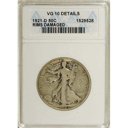 <B>1921-D 50C --Rim Damaged--ANACS. VG10 Details.</B></I> NGC Census: (88/349). PCGS Population (79/386). Mintage: 208,000. Numismedia Wsl. Price: $279. (#6584)<BR><BR><b>Shipping:</b> Coins & Currency (<a target="_blank" href="http://www.heritageauctions.com/common/shipping.php">view shipping information</a>)