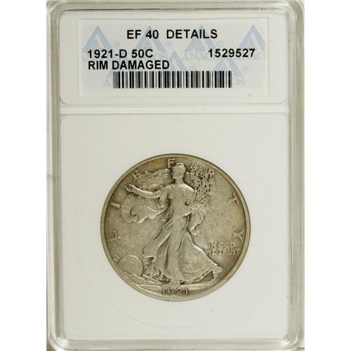 <B>1921-D 50C --Rim Damaged--ANACS. XF40 Details.</B></I> This is a pleasing, light-gray example with evenly worn devices and hints of plum color near the peripheries. There are a few minor marks on each side, and a large rim abrasion is noted just to the left of the mintmark.<BR><BR><b>Shipping:</b> Coins & Currency (<a target="_blank" href="http://www.heritageauctions.com/common/shipping.php">view shipping information</a>)