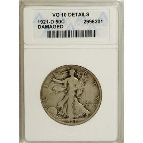 <B>1921-D 50C --Damaged--ANACS. VG10 Details.</B></I> NGC Census: (41/262). PCGS Population (83/406). Mintage: 208,000. Numismedia Wsl. Price for NGC/PCGS coin in VG10: $296. (#6584)<BR><BR><B>Coin Engraver:</B> Adolph A. Weinman<BR><BR><b>Shipping:</b> Coins & Currency (<a target="_blank" href="http://www.heritageauctions.com/common/shipping.php">view shipping information</a>\)