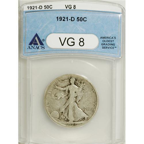<B>1921-D 50C VG8 ANACS.</B></I> NGC Census: (88/437). PCGS Population (88/473). Mintage: 208,000. Numismedia Wsl. Price for NGC/PCGS coin in VG8 : $239. (#6584)<BR><BR><b>Shipping:</b> Coins & Currency (<a target="_blank" href="http://www.heritageauctions.com/common/shipping.php">view shipping information</a>)