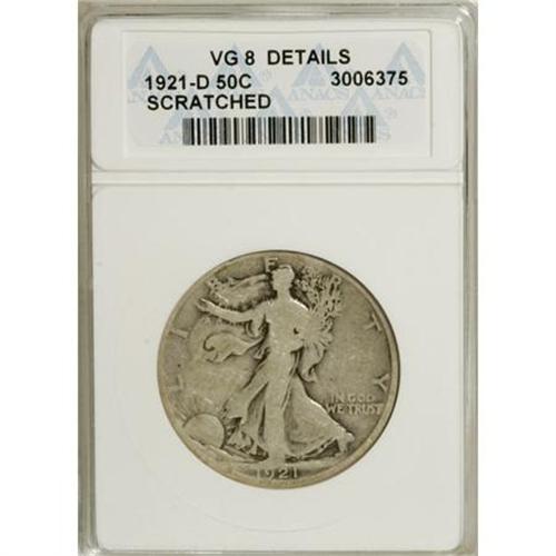 <B>1921-D 50C --Scratched--ANACS. VG8 Details.</B></I> NGC Census: (53/303). PCGS Population (95/498). Mintage: 208,000. Numismedia Wsl. Price for NGC/PCGS coin in VG8 : $265. (#6584)<BR><BR><B>Coin Engraver:</B> Adolph A. Weinman<BR><BR><b>Shipping:</b> Coins & Currency (<a target="_blank" href="http://www.heritageauctions.com/common/shipping.php">view shipping information</a>)