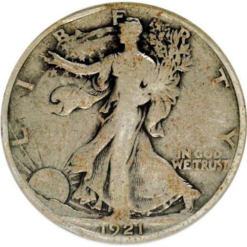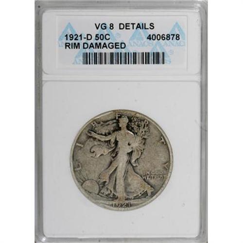 <B>1921-D 50C --Rim Damaged--ANACS. VG8 Details.</B></I> NGC Census: (54/306). PCGS Population (96/506). Mintage: 208,000. Numismedia Wsl. Price for NGC/PCGS coin in VG8 : $265. (#6584)<BR><BR><B>Coin Engraver:</B> Adolph A. Weinman<BR><BR><b>Shipping:</b> Coins & Currency (<a target="_blank" href="http://www.heritageauctions.com/common/shipping.php">view shipping information</a>)