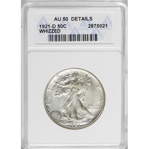 <B>1921-D<50C>--Whizzed--ANACS. AU50 Details.</B></I> Lightly worn with the usual weakness on the highpoints. The unnaturally lustrous gold-gray surfaces have wire brush marks near the obverse devices.