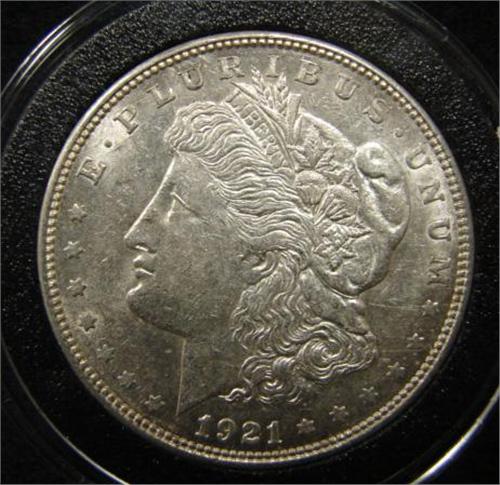 1921-D U.S. MORGAN SILVER DOLLAR. Coin is in circular case.