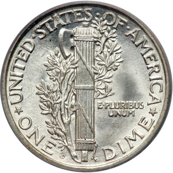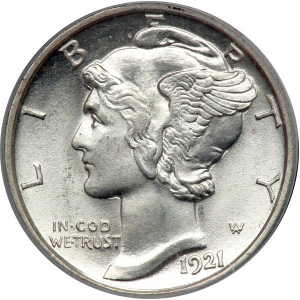 1921-D Mercury Dime. PCGS graded MS-63 PQ. Well struck and white with glinting luster throughout the surfaces. The bands are almost full. 1921 and 1921-D are scarcer issues in the 1920s. After the boomtime conditions of 1917-18, things continued along fine in 1919-20 in the aftermath of the Great War Armistice of 11/11/1918, but then a recession set in in 1921 which caused the banks to request fewer circulating coins from the Treasury. The Treasury in turn ordered the Mints to reduce production as evidenced by the much lower mintage this year in most denominations except silver dollars. Pop 22; 52 finer (PCGS # 4936) .