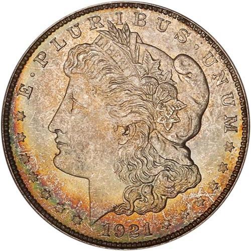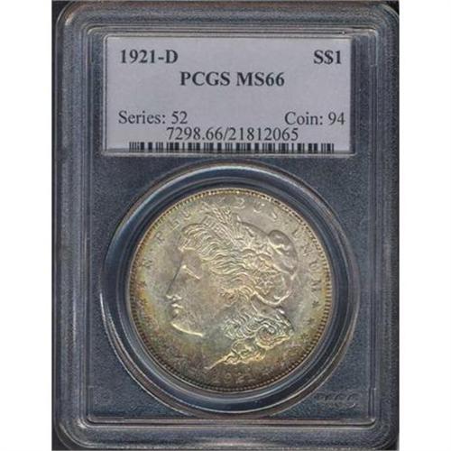 <b>1921-D Morgan Dollar. PCGS graded MS66.</b> From center to periphery the intense flood of silvery luster glows underneath original (and quite attractive) toning.; the toning is on both sides <b>(PCGS # 7298)</b>