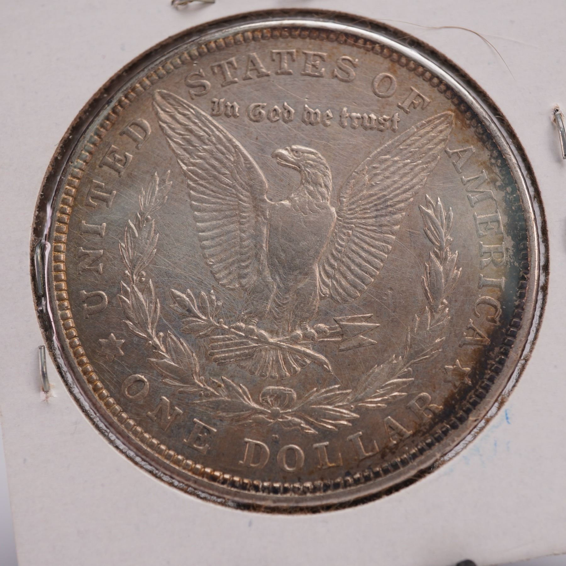 Issued by the Denver Mint and distinguished by the "D" mintmark, this 1921-D Morgan Silver Dollar bears the time-honored obverse portrait of Liberty facing left, crowned with a band reading LIBERTY and framed by cotton bolls and wheat heads, with the encircling motto E PLURIBUS UNUM, thirteen stars, and the date 1921 below. The reverse presents a striking depiction of a bald eagle with spread wings, clutching arrows and an olive branch, surrounded by a laurel wreath and the inscriptions UNITED STATES OF AMERICA, IN GOD WE TRUST, and ONE DOLLAR. Enclosed in a cardboard holder. Holder measures: 2"L x 2"H. Coin diameter: 38.1 mm.