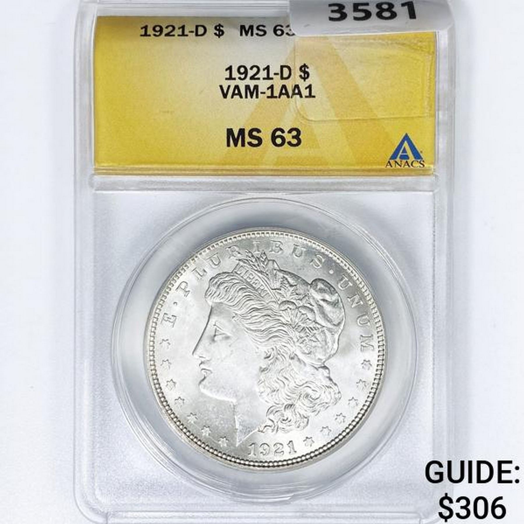 1921-D Morgan Silver Dollar ANACS MS63 VAM-1AA1
