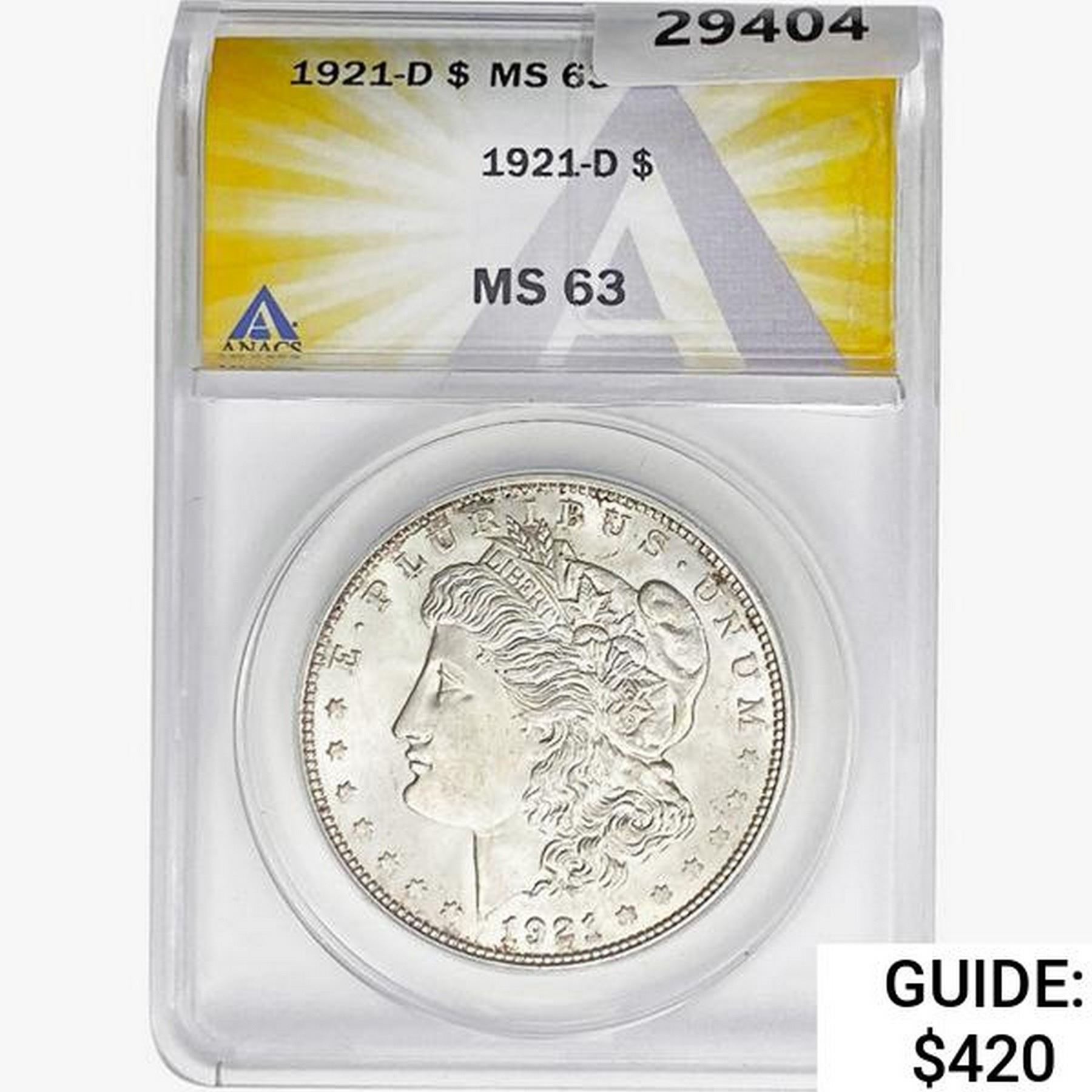 1921-D Morgan Silver Dollar ANACS MS63