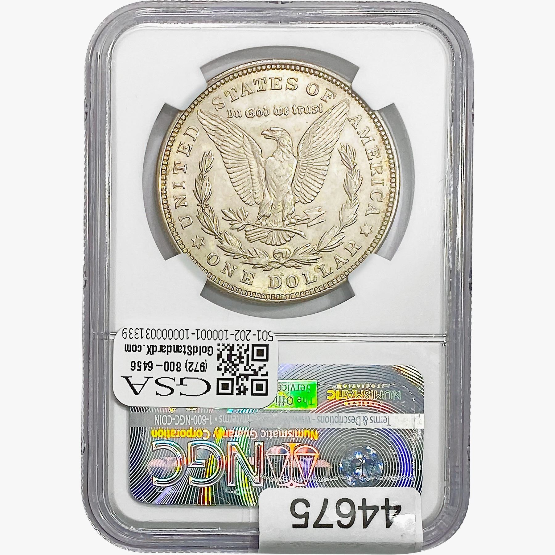 e. Coins sold referencing a third-party grading service are sold “AS IS” without any express or implied warranty, except for a guarantee by GSA that they are genuine. Removal or alteration of the holder, voids all of Bidder’s claims concerning that Product. Certain warranties may be available from the grading services and Bidders are referred to them for further details: Numismatic Guaranty Corporation (NGC), PO Box 4776, Sarasota, FL 34230, www.ngccoin.com/services/writtenguarantee.asp; Professional Coin Grading Services (PCGS), PO Box 9458, Newport Beach, CA 92658, www.pcgs.com/guarantee.html; ANACS, 6555 S. Kenton St., Ste. 303, Englewood, CO 80111; and Independent Coin Grading Co. (ICG), 7901 East Bellview, Ave., Suite 50, Englewood, CO 80111.
