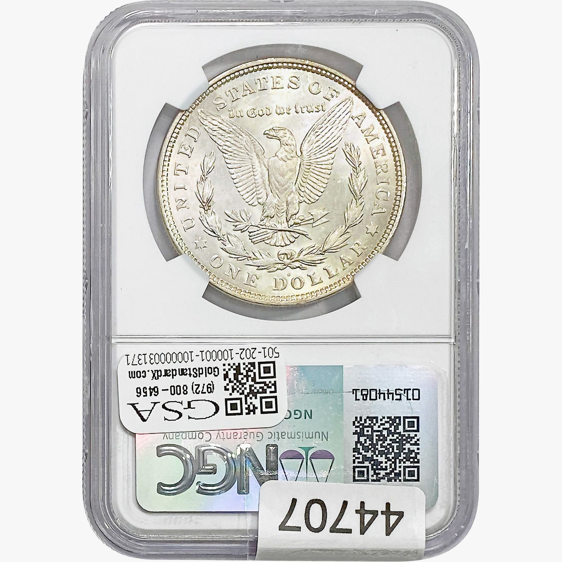e. Coins sold referencing a third-party grading service are sold “AS IS” without any express or implied warranty, except for a guarantee by GSA that they are genuine. Removal or alteration of the holder, voids all of Bidder’s claims concerning that Product. Certain warranties may be available from the grading services and Bidders are referred to them for further details: Numismatic Guaranty Corporation (NGC), PO Box 4776, Sarasota, FL 34230, www.ngccoin.com/services/writtenguarantee.asp; Professional Coin Grading Services (PCGS), PO Box 9458, Newport Beach, CA 92658, www.pcgs.com/guarantee.html; ANACS, 6555 S. Kenton St., Ste. 303, Englewood, CO 80111; and Independent Coin Grading Co. (ICG), 7901 East Bellview, Ave., Suite 50, Englewood, CO 80111.