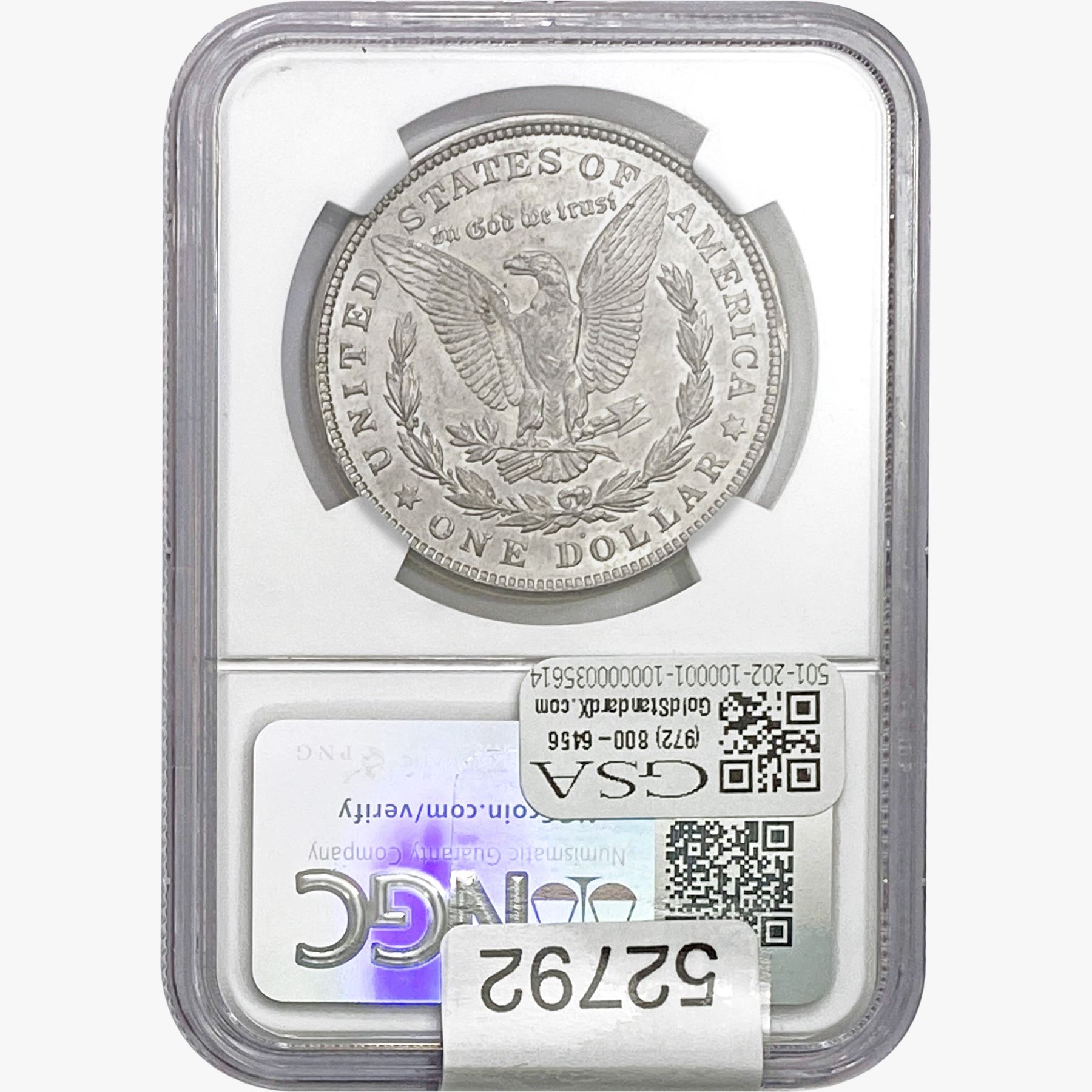 e. Coins sold referencing a third-party grading service are sold “AS IS” without any express or implied warranty, except for a guarantee by GSA that they are genuine. Removal or alteration of the holder, voids all of Bidder’s claims concerning that Product. Certain warranties may be available from the grading services and Bidders are referred to them for further details: Numismatic Guaranty Corporation (NGC), PO Box 4776, Sarasota, FL 34230, www.ngccoin.com/services/writtenguarantee.asp; Professional Coin Grading Services (PCGS), PO Box 9458, Newport Beach, CA 92658, www.pcgs.com/guarantee.html; ANACS, 6555 S. Kenton St., Ste. 303, Englewood, CO 80111; and Independent Coin Grading Co. (ICG), 7901 East Bellview, Ave., Suite 50, Englewood, CO 80111.