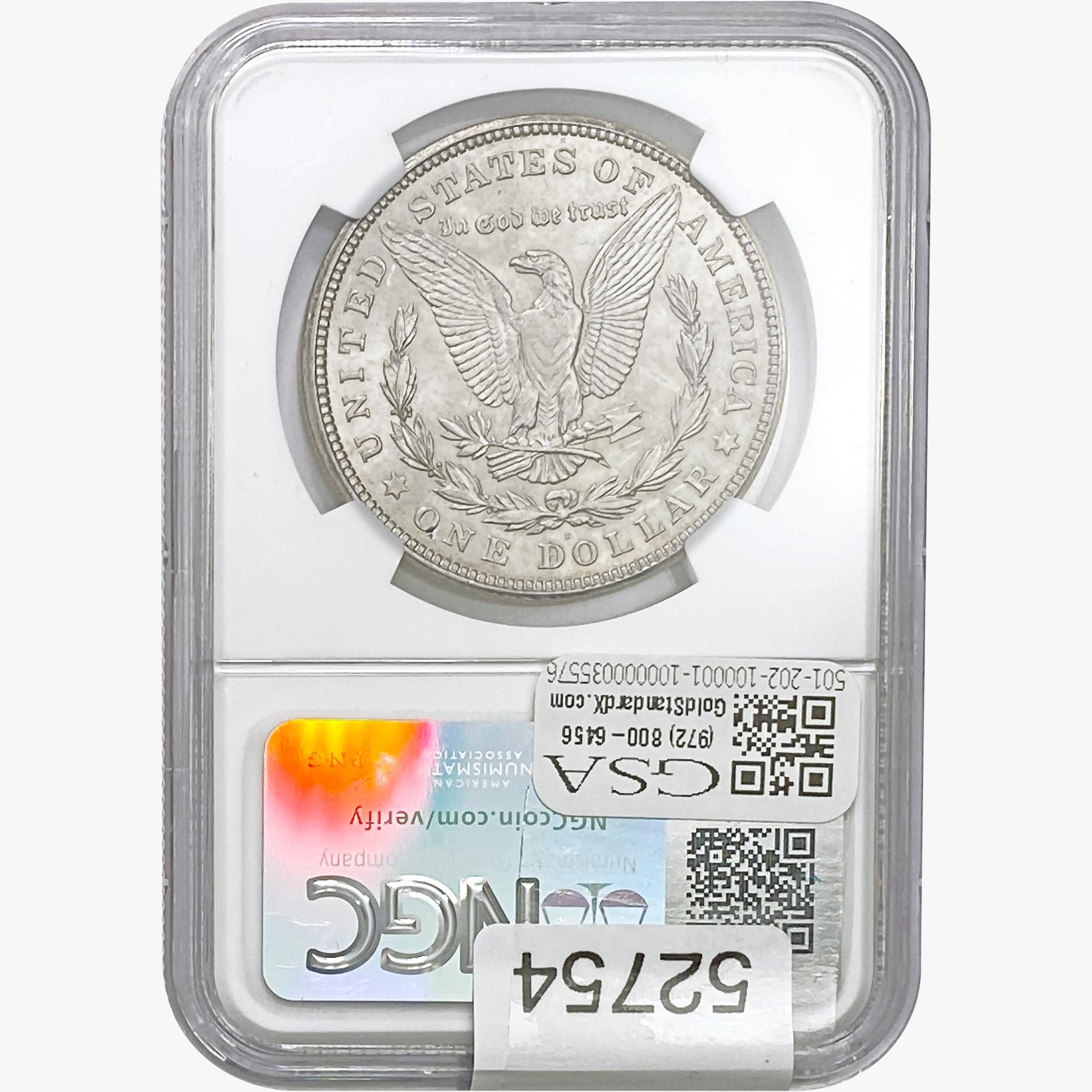e. Coins sold referencing a third-party grading service are sold “AS IS” without any express or implied warranty, except for a guarantee by GSA that they are genuine. Removal or alteration of the holder, voids all of Bidder’s claims concerning that Product. Certain warranties may be available from the grading services and Bidders are referred to them for further details: Numismatic Guaranty Corporation (NGC), PO Box 4776, Sarasota, FL 34230, www.ngccoin.com/services/writtenguarantee.asp; Professional Coin Grading Services (PCGS), PO Box 9458, Newport Beach, CA 92658, www.pcgs.com/guarantee.html; ANACS, 6555 S. Kenton St., Ste. 303, Englewood, CO 80111; and Independent Coin Grading Co. (ICG), 7901 East Bellview, Ave., Suite 50, Englewood, CO 80111.