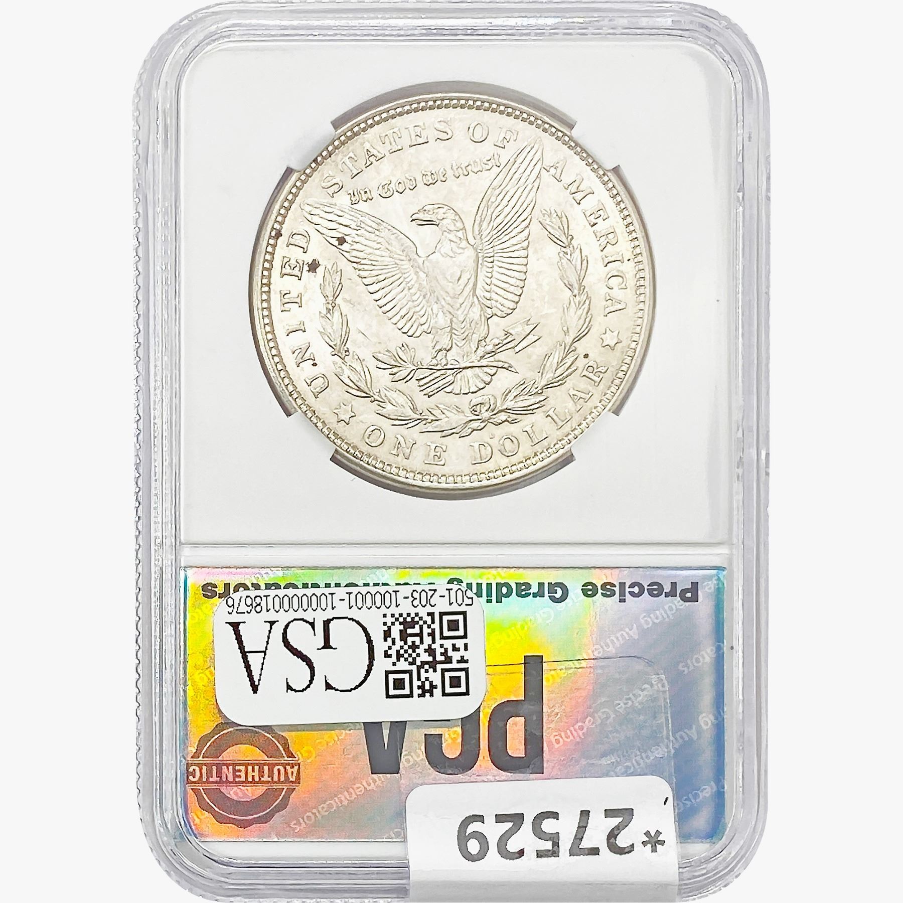 COINS AND CURRENCY LISTED IN GSA’S CATALOG AS GRADED AND ENCAPSULATED BY PCGS, NGC, ANACS, ICG, PCGS CURRENCY, PMG, PCGS BANKNOTE GRADING, CMC OR ANY OTHER THIRD-PARTY GRADING SERVICE ARE LIKEWISE SOLD “AS-IS” EXCEPT AS EXPRESSLY SET FORTH HEREIN. ALL THIRD-PARTY GRADING SERVICE GUARANTEES, INCLUDING AUTHENTICITY, ARE THE SOLE RESPONSIBILITY OF THE THIRD-PARTY GRADING SERVICE AND NOT WARRANTIES OR GUARANTEES OF GSA. BIDDERS SHOULD CONTACT THESE THIRD-PARTY GRADING SERVICES DIRECTLY WITH RESPECT TO ANY CLAIMS OR QUESTIONS THEY MAY HAVE CONCERNING THEIR GUARANTEES AND WARRANTIES. BIDDERS ACKNOWLEDGE AND AGREE THAT AUCTIONEER IS NOT BOUND BY OR LIABLE FOR ANY OPINION OR CERTIFICATION BY ANY THIRD-PARTY GRADING SERVICE. REMOVAL OF A PRODUCT FROM ITS PROTECTIVE CASING OR HOLDER OR ALTERATION OF ANY COIN HOLDER WAIVES ALL RIGHTS CONCERNING THE PRODUCT CONTAINED THEREIN.