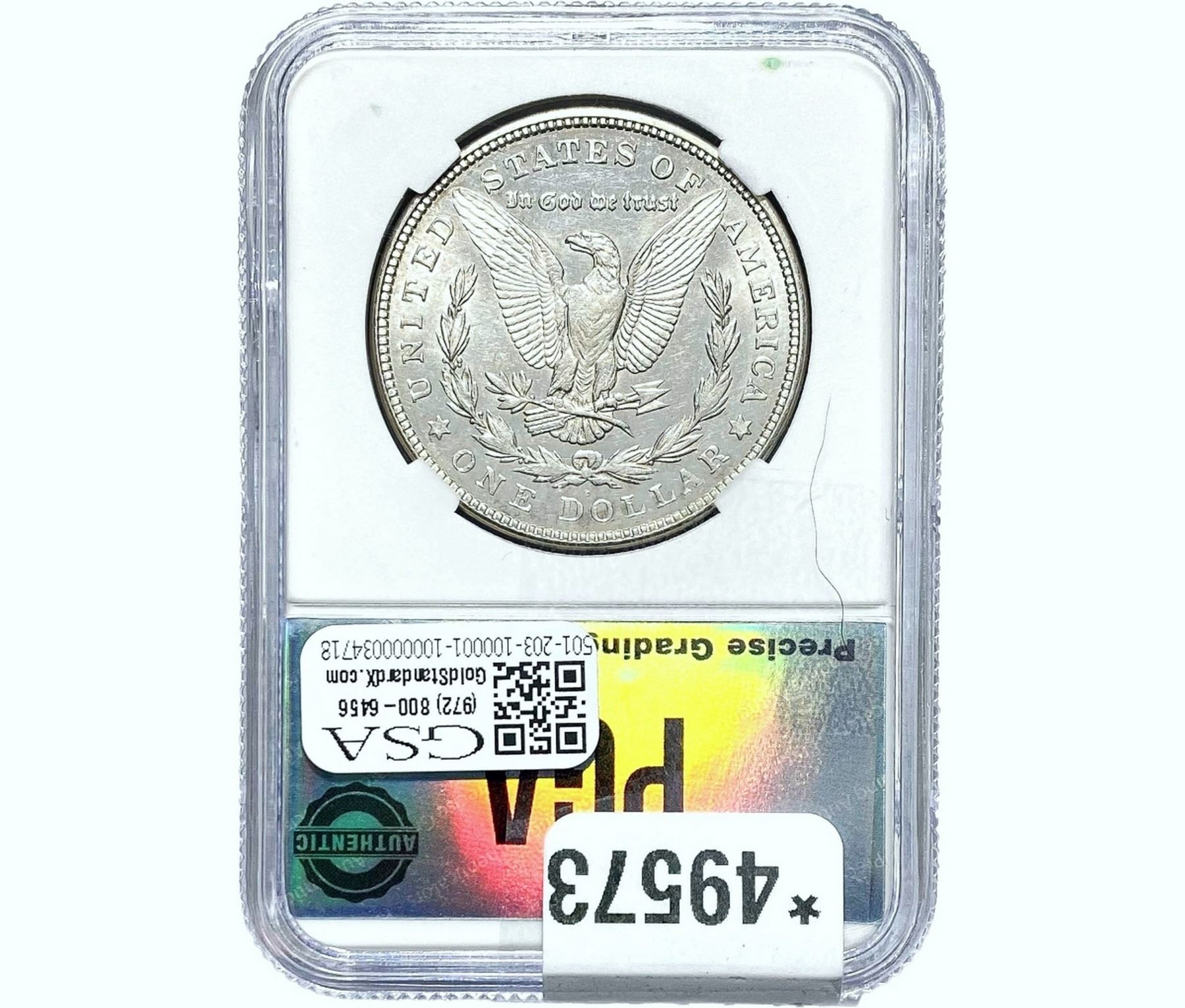 e. Coins sold referencing a third-party grading service are sold “AS IS” without any express or implied warranty, except for a guarantee by GSA that they are genuine. Removal or alteration of the holder, voids all of Bidder’s claims concerning that Product. Certain warranties may be available from the grading services and Bidders are referred to them for further details: Numismatic Guaranty Corporation (NGC), PO Box 4776, Sarasota, FL 34230, www.ngccoin.com/services/writtenguarantee.asp; Professional Coin Grading Services (PCGS), PO Box 9458, Newport Beach, CA 92658, www.pcgs.com/guarantee.html; ANACS, 6555 S. Kenton St., Ste. 303, Englewood, CO 80111; and Independent Coin Grading Co. (ICG), 7901 East Bellview, Ave., Suite 50, Englewood, CO 80111.