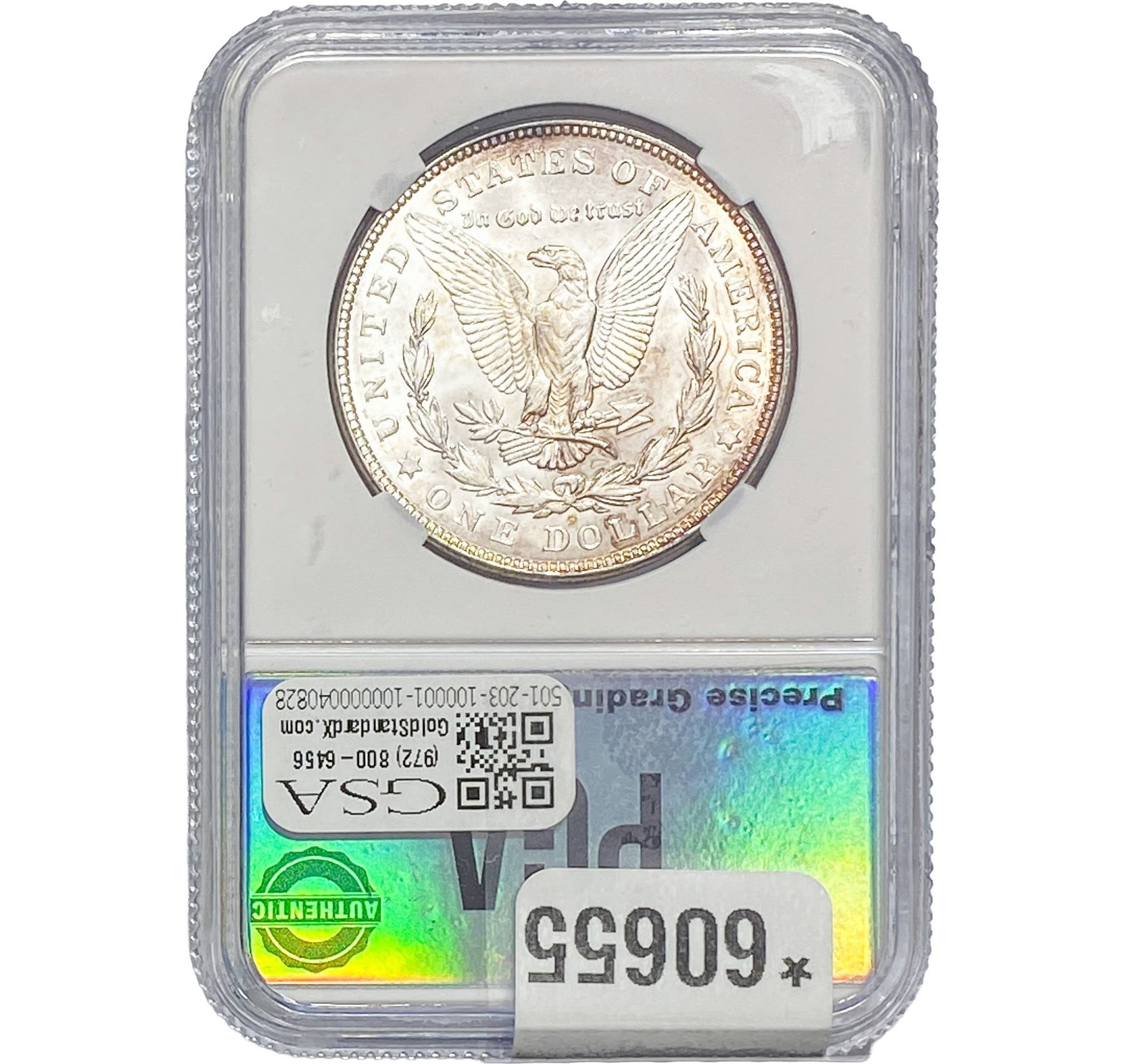 l. All non-certified coins and currency are guaranteed genuine, but are not guaranteed as to grade, since grading is a matter of opinion, an art and not a science, and therefore the description rendered by GSA or any third-party grading service may not agree with the opinion of others (including trained experts), and the same expert may not grade the same item with the same grade at two different times. GSA may, but is not obligated to, express an opinion as to non-certified numismatic items, in GSA’s opinion, or by its employees’ experience and the current interpretation of the American Numismatic Association’s standards as of the date the catalog was prepared. There is no guarantee or warranty expressed or implied that the grading opinions utilized by GSA, if any, will meet the standards of any grading service at any time in the future.