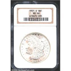 1921-D S$1 MS66 NGC. A lustrous and brilliant Gem. Gorgeously preserved and essentially as struck. The lower wreath has the intermittent softness of strike that is characteristic of the issue. Important notice: We expect to be auctioning lots at the rate of 200-250 per hour. Sometimes eBay Premier live bid software cannot keep up with that pace, so we strongly recommend that you place a realistic proxy bid now as insurance to avoid disappointment. Also please note that all Heritage/CAA lots purchased through eBay Premier carry a 20% Buyer's Premium. Please make sure you read the Terms and Conditions.