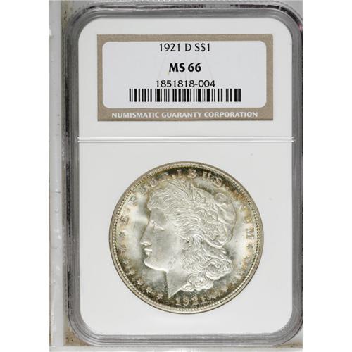 <B>1921-D<img border='0' src='http://www.heritagecoins.com/images/star.gif' width=10 height=10>$1> MS66 NGC.</B></I> A satiny example that sports a better-than-average strike for this issue. Gold-green and aqua patina dominates the fields of this Premium Gem.