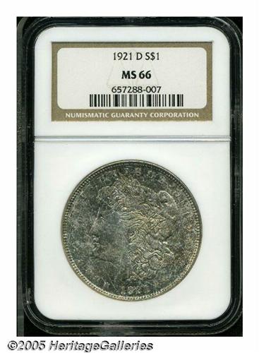 <B>1921-D<S$1> MS66 NGC.</B></I> Dappled apple-green and golden-brown toning dominates the obverse, while the reverse offers only light gold color. Well struck except for a few leaves in the wreath, this lustrous premium Gem is carefully preserved and clearly original.