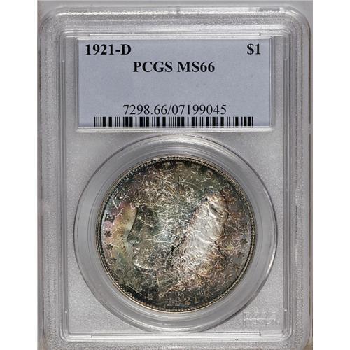 <B>1921-D<img border='0' src='http://www.heritagecoins.com/images/star.gif' width=10 height=10>$1> MS66 PCGS.</B></I> A sliver of brilliance on each side is surrounded by teal, russet, and forest-green patina. A boldly struck, high-grade example; PCGS has certified only five examples finer (7/06).