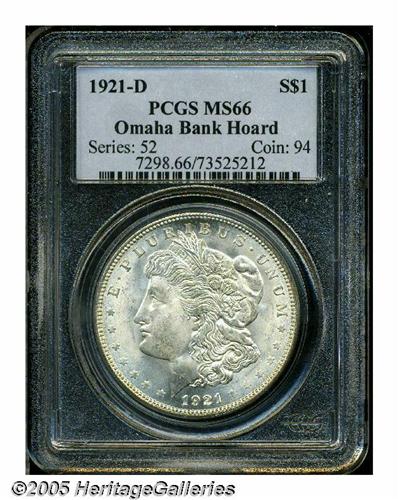 <B>1921-D<S$1> MS66 PCGS.</B></I> Ex: Omaha Bank Hoard. Well struck and lustrous, with essentially untoned surfaces that are expertly preserved and distraction-free. A superior example of the 1921-D Morgan Dollar.