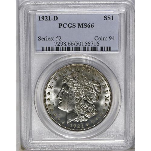 <B>1921-D<img border='0' src='http://www.heritagecoins.com/images/star.gif' width=10 height=10>$1> MS66 PCGS.</B></I> This Premium Gem has tan-gray toning over the highpoints and satiny luster. Some weakness of strike on the leaves of the wreath is typical for this issue. Only minuscule abrasions are located on the surfaces.<BR><I>From The Chicago-Ark Collection.</B></I>