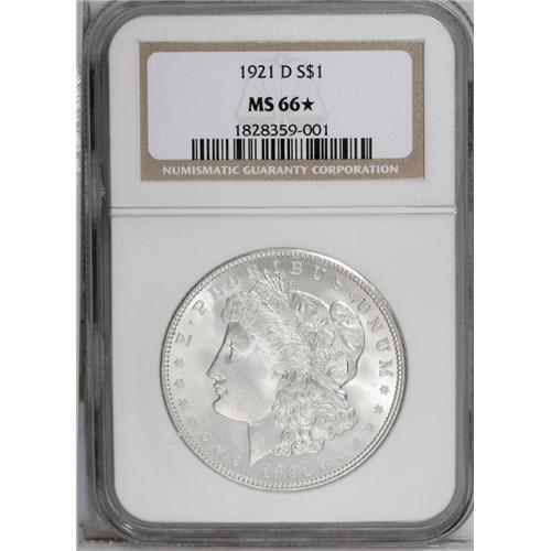 <B>1921-D<img border='0' src='http://www.heritagecoins.com/images/star.gif' width=10 height=10>$1> MS66 <img border='0' src='http://www.heritagecoins.com/images/star.gif' width=10 height=10> NGC.</B></I> This stone-white and thoroughly lustrous Premium Gem is reasonably struck and well preserved. Despite a bountiful production, the 1921-D is nearly unobtainable above the MS66 level. Census: 17 in 66 <img border='0' src='http://www.heritagecoins.com/images/star.gif' width=10 height=10>, 1 finer with the Star designation (6/06).<BR><I>From The New York Eye Appeal Collection.</B></I>