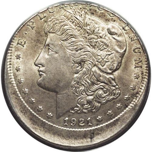 <B>1921-D<img border='0' src='http://www.heritagecoins.com/images/star.gif' width=10 height=10>$1> Morgan Dollar--Struck 13% Off Center--AU58 PCGS.</B></I> A boldly impressed Morgan dollar, struck 13% off center between 12 and 1 o'clock. A trace of highpoint friction appears over the devices, but this remains an important and unusual mint error; few silver dollar errors were ever released. Attractive gold-gray and lilac patina covers each side.