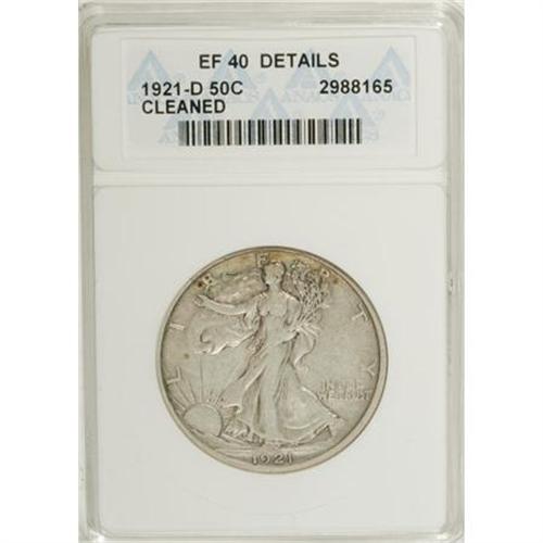 <B>1921-D 50C --Cleaned--ANACS. XF40 Details.</B></I> Primarily cream-gray, but ice-blue and orange hues are present near the rims. Slightly cloudy from a mild cleaning. Liberty retains a majority of her skirt lines. The lowest mintage Walking Liberty issue.<BR><BR><b>Shipping:</b> Coins & Currency (<a target="_blank" href="http://www.heritageauctions.com/common/shipping.php">view shipping information</a>)