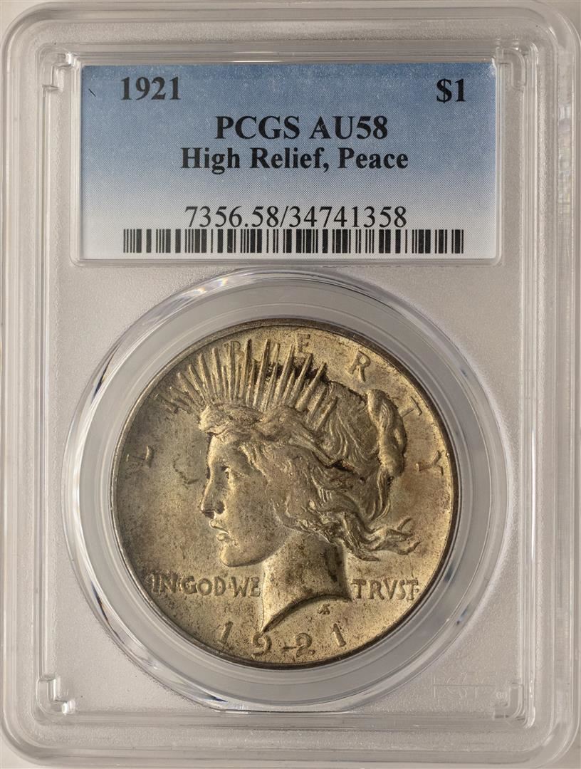 One 1921 High Relief $1 Peace Silver Dollar Coin PCGS AU58. PCGS Graded.