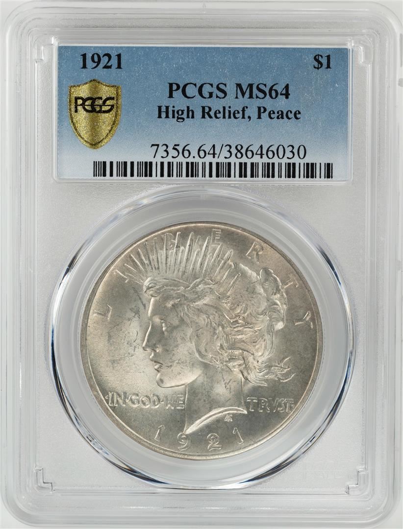One 1921 High Relief $1 Peace Silver Dollar Coin PCGS MS64. PCGS Graded.