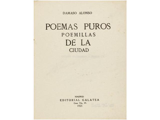 1921., LIBRO: (LITERATURA ESPAÑOLA-POESIA),. ALONSO, DÁMASO:, POEMAS PUROS. POEMILLAS DE LA CIUDAD., Madrid: Imp. Pueyo, 1921. 8º menor. 108 p.+ 2 h. Rústica. Primera edición de la obra inicial del autor, rarísima.