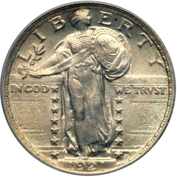 1921 Liberty Standing Quarter Dollar. PCGS graded MS-63. A hint of light tone, choice with satin-finish luster on all devices. With one or two exceptions (one-cent and Morgan dollar), U.S. coins struck in the year 1921 tend to be scarce to rare depending upon condition. The slowdown in production lasted through 1922 for the most part before coinage production turned up at all three Mints. The 1921 Standing Liberty Quarter Dollar is famous for its elusiveness in choice Mint State condition (PCGS # 5740) .