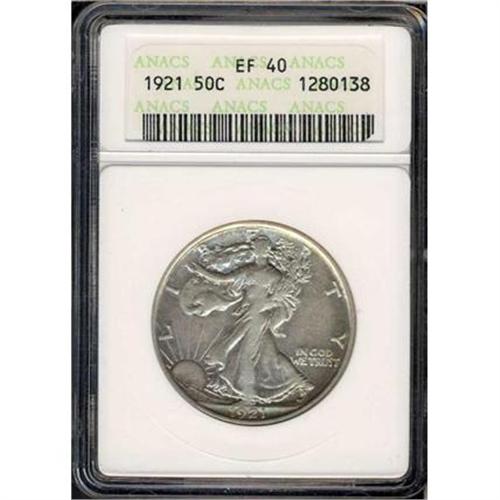<b>1921 Liberty Walking Half Dollar. ANACS graded EF40.</b> Attractive smooth surfaces with balanced wear on both sides and no rim damage. A key low mintage issue: only 246,000 made of the 1921-D <b>(PCGS # 6583)</b>