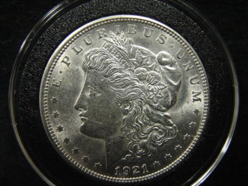 1921 U.S. MORGAN SILVER DOLLAR. Coin is in circular case.