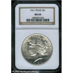 <B>1921<img border='0' src='http://www.heritagecoins.com/images/star.gif' width=10 height=10>$1 MS64 NGC.</B></I> Brilliant surfaces display radiant luster, and a few minor luster grazes. The centers are weakly struck, as is often the case for this issue. Lot:10677