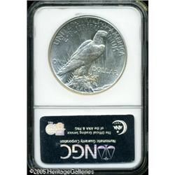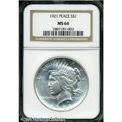 <B>1921<img border='0' src='http://www.heritagecoins.com/images/star.gif' width=10 height=10>$1 MS64 NGC.</B></I> Brilliant surfaces yield radiant luster and a few small to moderate marks on Liberty's face and the eagle. Lot:10674