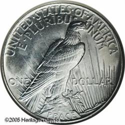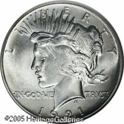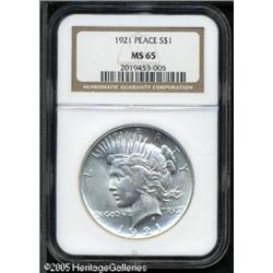 <B>1921<img border='0' src='http://www.heritagecoins.com/images/star.gif' width=10 height=10>$1 MS65 NGC.</B></I> The popular Peace dollar made its debut shortly after the end of World War I and was suggested by numismatist Farran Zerbe. This is a frosty Gem that, while not fully struck, is sharper than most. The surfaces are nearly pristine with only a couple minor blemishes. Lot:10679