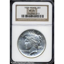 <B>1921<img border='0' src='http://www.heritagecoins.com/images/star.gif' width=10 height=10>$1 MS65 NGC.</B></I> This is a brilliant Gem with satiny silver luster and outstanding eye appeal. It is sharply struck, more so than usually seen. Lot:10683