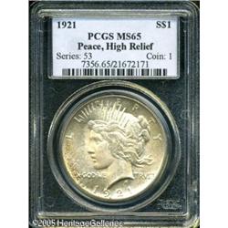 <B>1921<img border='0' src='http://www.heritagecoins.com/images/star.gif' width=10 height=10>$1 MS65 PCGS.</B></I> Fully lustrous, but just a bit soft in the centers. Both sides are toned in a mottled golden brown color which is both attractive and completely original. This is a lovely example of the high relief Peace Dollar. Lot:10678