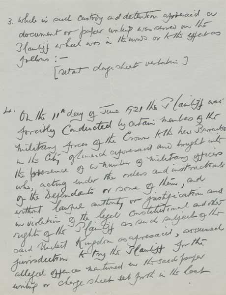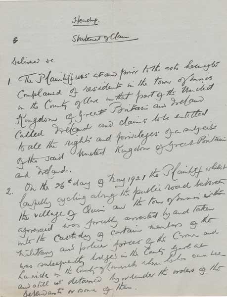 Hugh Kennedy was later Attorney General to the Provisional Government of Ireland and Chief Justice of the Irish Free State. The notes are relating to a claim against the Crown on behalf of the arrested man, who was seized by the Tans while cycling between Quin and Ennis. Interesting argument of Common Law versus the Martial Law imposed in the area. The identity of the Plaintiff is not known.