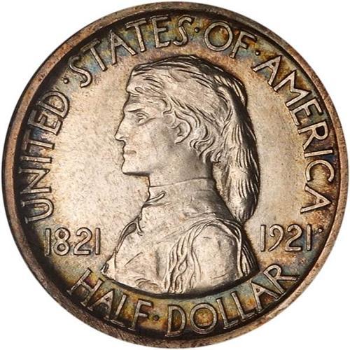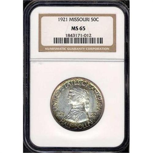 <b>1921 Missouri Half Dollar, no 2 x 4. NGC graded MS65.</b> An outrageously fresh looking example of this often problematic 2x2 variety, with stark contrast between the satiny fields and significantly bold devices. Faithful to every detail from a full blow by the dies, there is nice hair on the portraits and almost as bold detail on the standing figures of the reverse. Mintage was very low: 6,000 pieces <b>(PCGS # 9330)</b> <i>