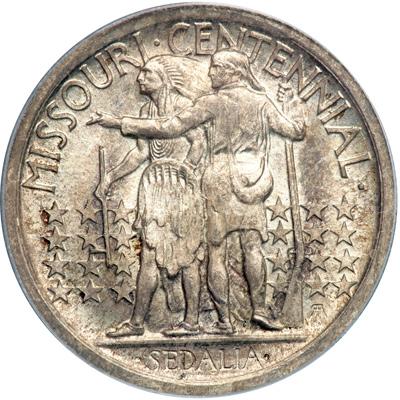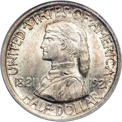 1921 Missouri Half Dollar, no 2 x 4. PCGS graded MS-65. Pleasing oriiginal antique toning on both sides. Eye-catching satin luster pours from top to bottom on the silvery surfaces, something of a catharsis for collectors who may have waded through too many not-quite-there Missouri commemoratives hoping to find the right coin. Hard to get hold of in Gem condition. This is a strongly struck example, it should be added, with detail aplenty on all the right areas. Pop 220; 29 in 66 (PCGS # 9330) .