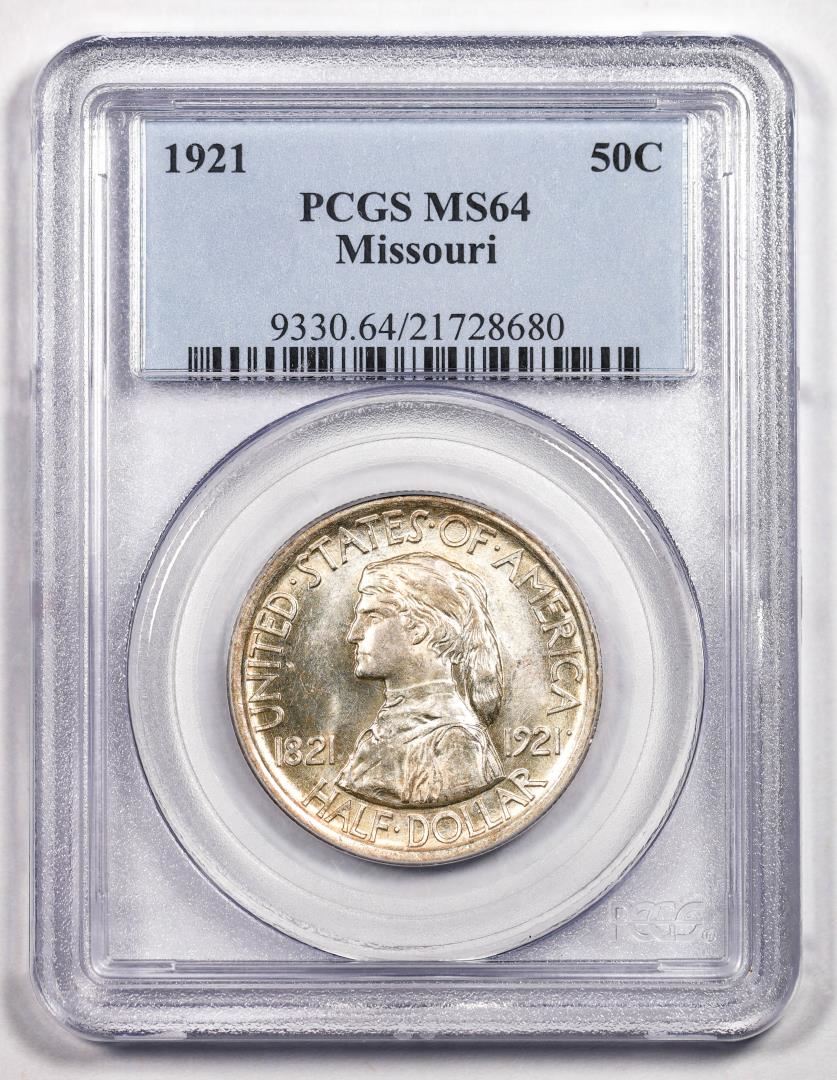 One 1921 Missouri Centennial Commemorative Half Dollar Coin PCGS MS64. PCGS Graded.