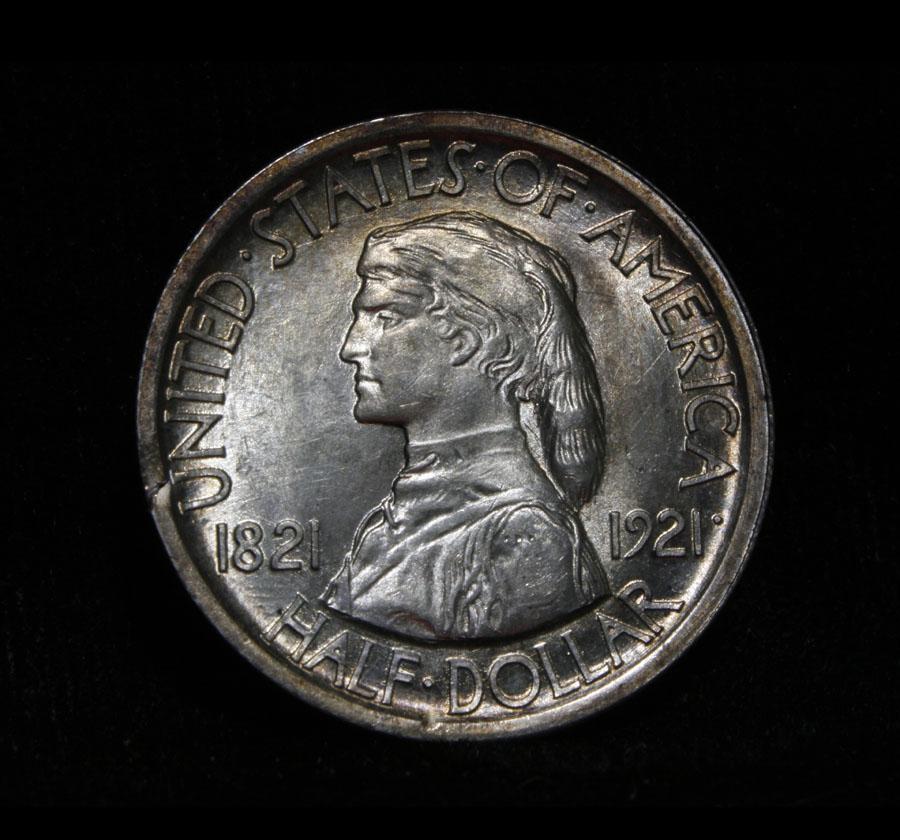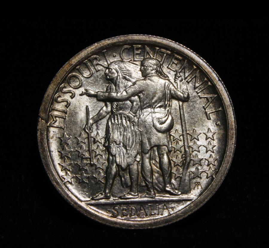 A very pretty example. All Original , golden toned with a darker rim, very nice eye appeal. Wild Planchet crack, going through the rim at 8 O'clock. Very cool Planchet defect, I will offer my personal buy back guarantee, that this coin is all original and will not come back Ungradeable by any major grading service. The Obverse Depicts Daniel Boon, even though he was best known for his exploits in Kentucky, since he made his home in Missouri for the last quarter of his life. When examining a Missouri Centennial for wear, on the obverse, friction first shows on Boone's cheek and on the hair behind his ear and shoulder. On the reverse, rub is first evident on the arm of the frontiersman. Coin World's Coin Values lists ms64 at $1300 and The Wholesale Greysheet lists ms64 at $975. Estimated Value $1100