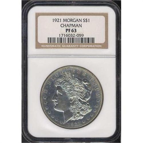 <b>1921 Morgan Dollar. Chapman. NGC graded Proof 63.</b> Light milky gray toning with some flecks of white, over somewhat prooflike surfaces. A hybrid between a deep mirror Proof and a circulation strike, the so-called "Chapman Proof" varieties, popular in their own right, are from dies that still show some preparation lines. The striking is indeed special on this so-called Chapman Proof, and the detail is far finer than seen on a typical 1921 Morgan dollar, most of which are indifferently if not sloppily struck, and which have poor eye appeal. The present piece is splendid to gaze upon and is beautiful in every regard. No doubt the advanced collector of Morgan dollars will bid accordingly.